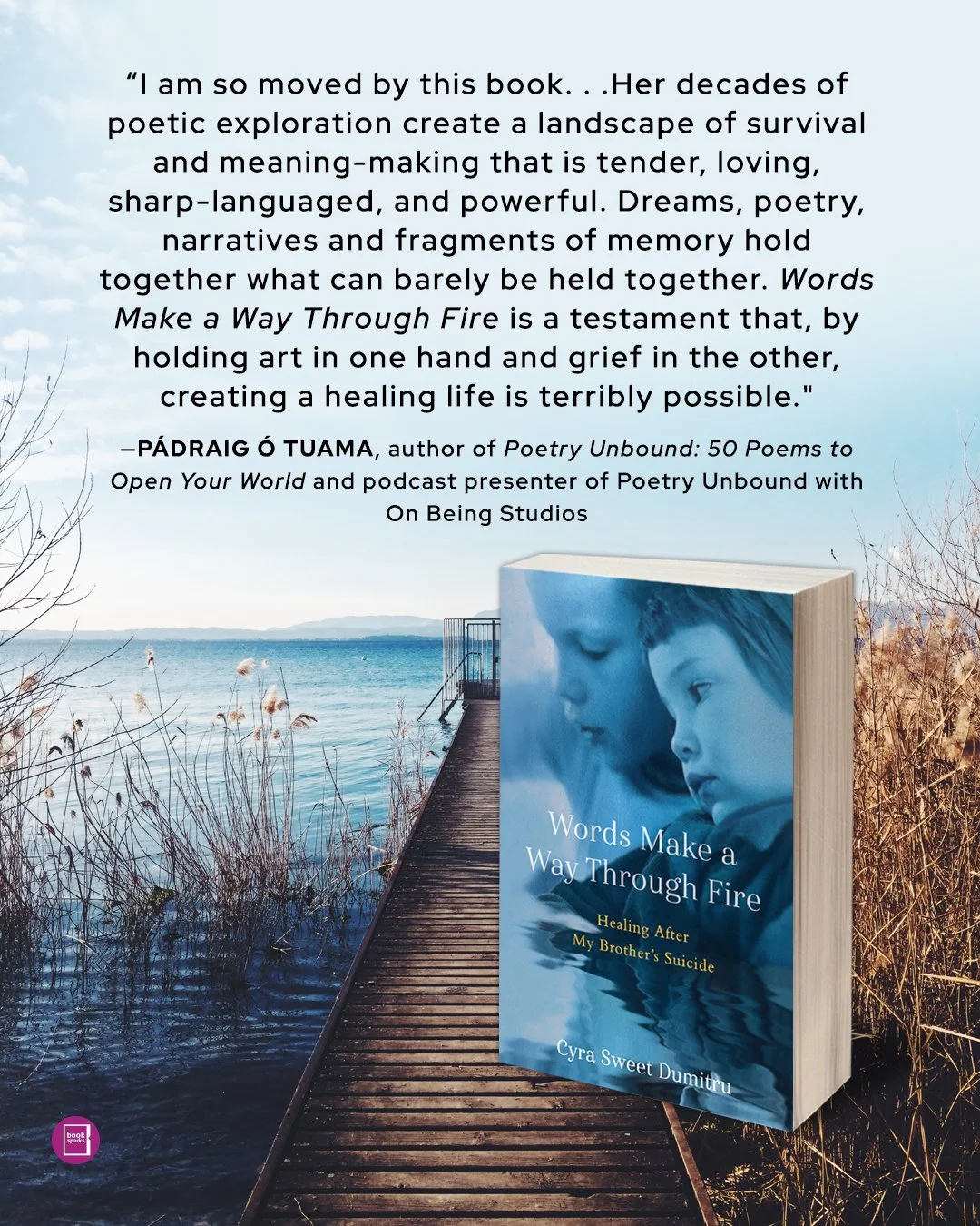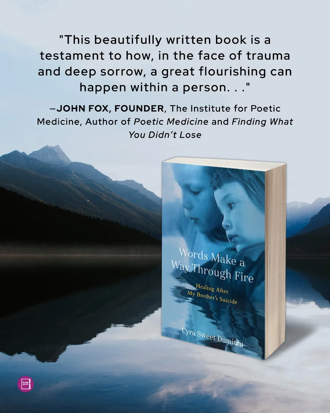 In Words Make a Way through Fire, Cyra explores the specific medicinal properties of poetry—giving order to interior anxiety, finding perspective through metaphor, trusting the wisdom within—and invites her brother David to speak through her as he reflects upon his final hours. In doing so, poem by poem, she shifts gradually from being traumatized and feeling haunted to feeling empowered and spiritually expansive.